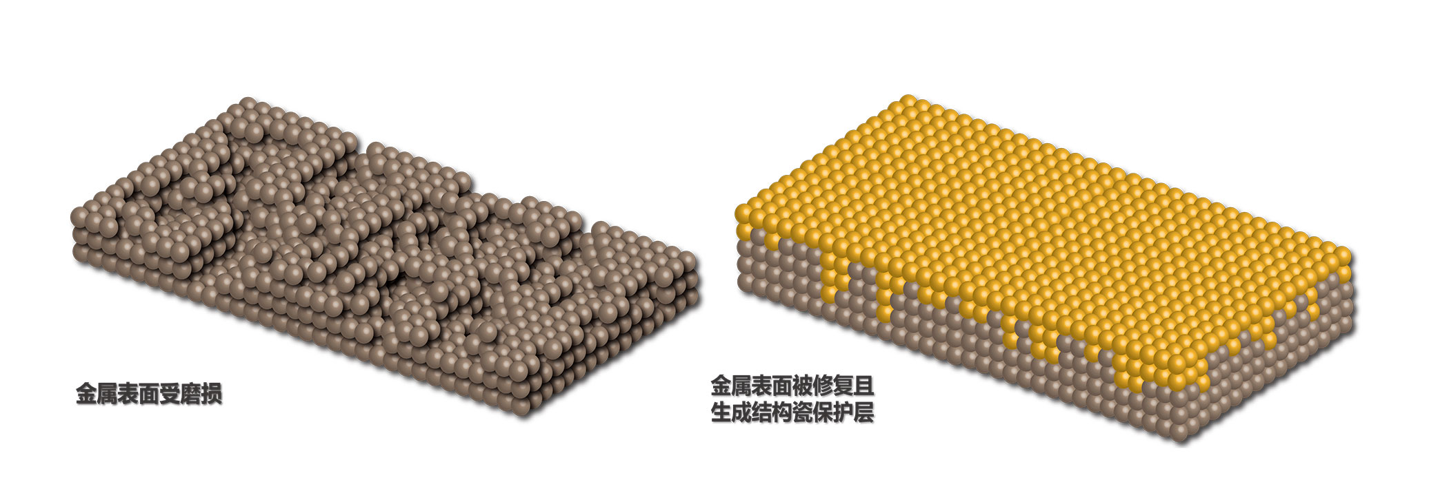 金属磨损自修复技术特点是:在机械装备不解体的情况下,可在机械装备运行过程中完成铁基金属磨损部位的自行修复,生成减磨性能优异的金属结构瓷保护层,使摩擦表面硬度和光洁度提高,摩擦系数大幅度降低,并使已经磨损的部位恢复到原来的尺寸,大幅度延长设备的使用寿命,节约能耗。金属磨损自修复技术不仅能预防机件磨损,还能自行修复处于长期运行中已磨损的机件磨擦表面。