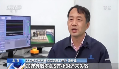 北京航空材料研究院高级工程师 汤春峰:飞机要飞几千小时上万小时,如果轴承出了故障,发动机就不能使用了,它是发动机的中枢。试验模拟了航空发动机的工作状况,到目前为止,已经试验加速等效寿命5万小时还未失效,试验还在进行当中。