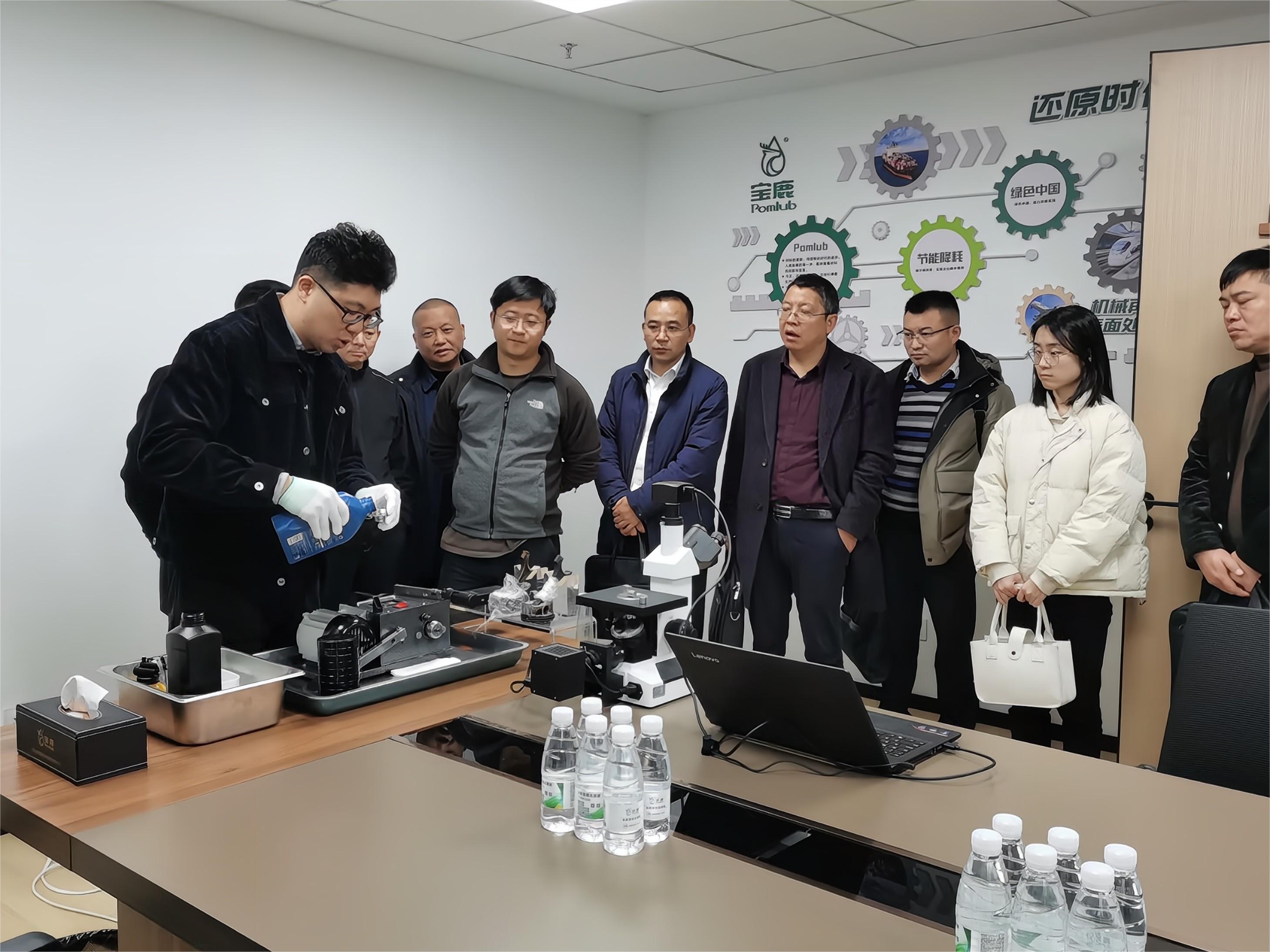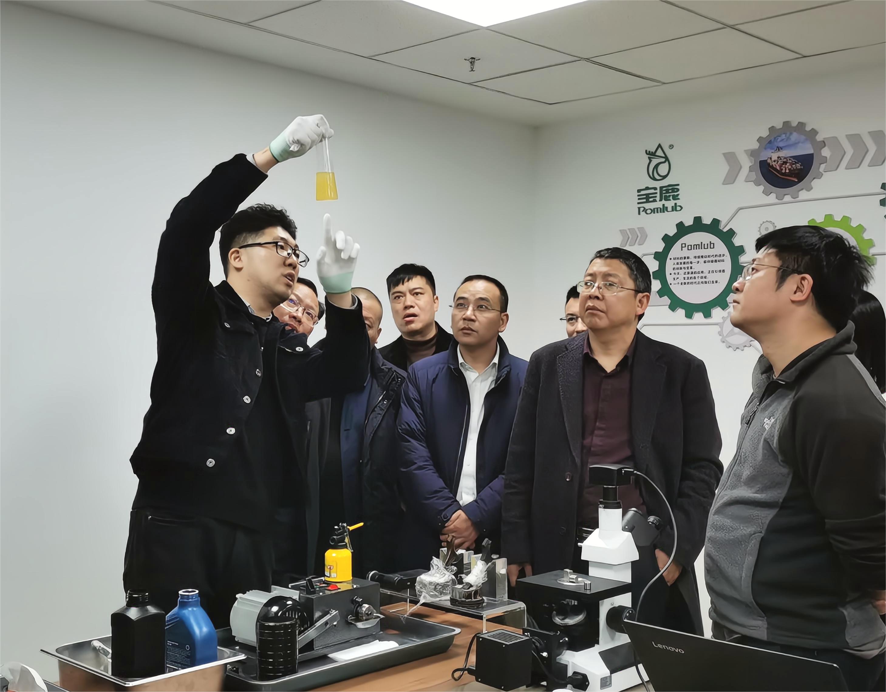 在产品实验室,瞿区长一行仔细观摩研发人员对“中科宝鹿还原液”的产品实验。当大家在现场看到,该产品采用微纳米、微焊接技术,可在设备正常运转过程中,在机件表面能够生长出一层超硬、超滑、超耐磨的新型结构物质—结构瓷,可以实现金属机件磨损自修复的场景时,都受到了强烈的震撼。