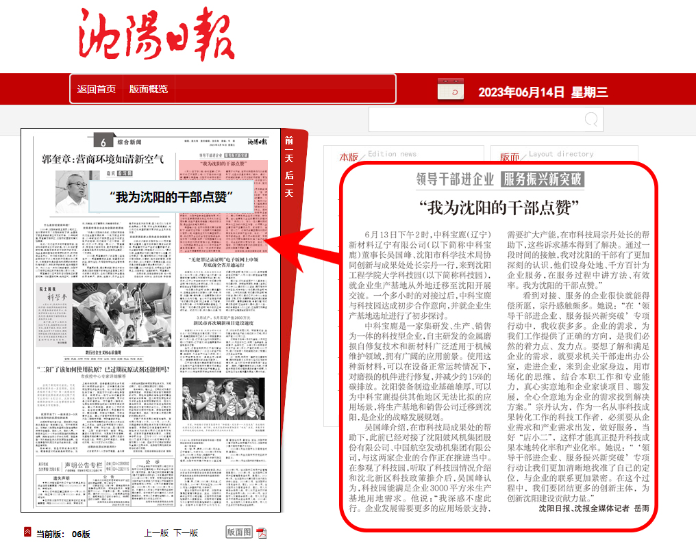 继沈阳日报报道后,6月18日沈阳广播电视台新闻综合频道,继续报道领导干部进企业 服务振兴新突破——市科技局:助力产学研合作 加快科技成果转化,中科宝鹿为沈阳领导干部点赞。