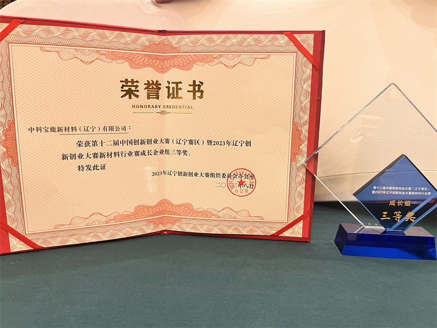 本次大赛中科宝鹿(辽宁)新材料有限公司,荣获第十二届中国创新创业大赛 (辽宁赛区 ) 暨2023年辽宁创新创业大赛新材料行业赛成长企业组三等奖。