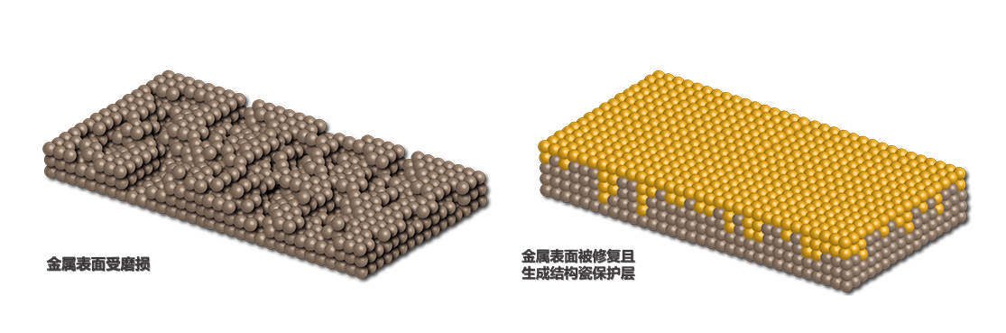 结构瓷层生长是有选择性的,只在金属机件摩擦磨损部位生长,生长速度和厚度与摩擦释放的能量、修复还原微粒的数量成正比,当金属机件的磨损间隙得到修复补偿,摩擦释放的能量降低,结构瓷层的生长速度减缓,修复还原微粒在金属机件间隙得到完全补偿和优化后,结构瓷层即停止生长,当新的磨损面出现时产生摩擦热能,自修复生长又重新启动。